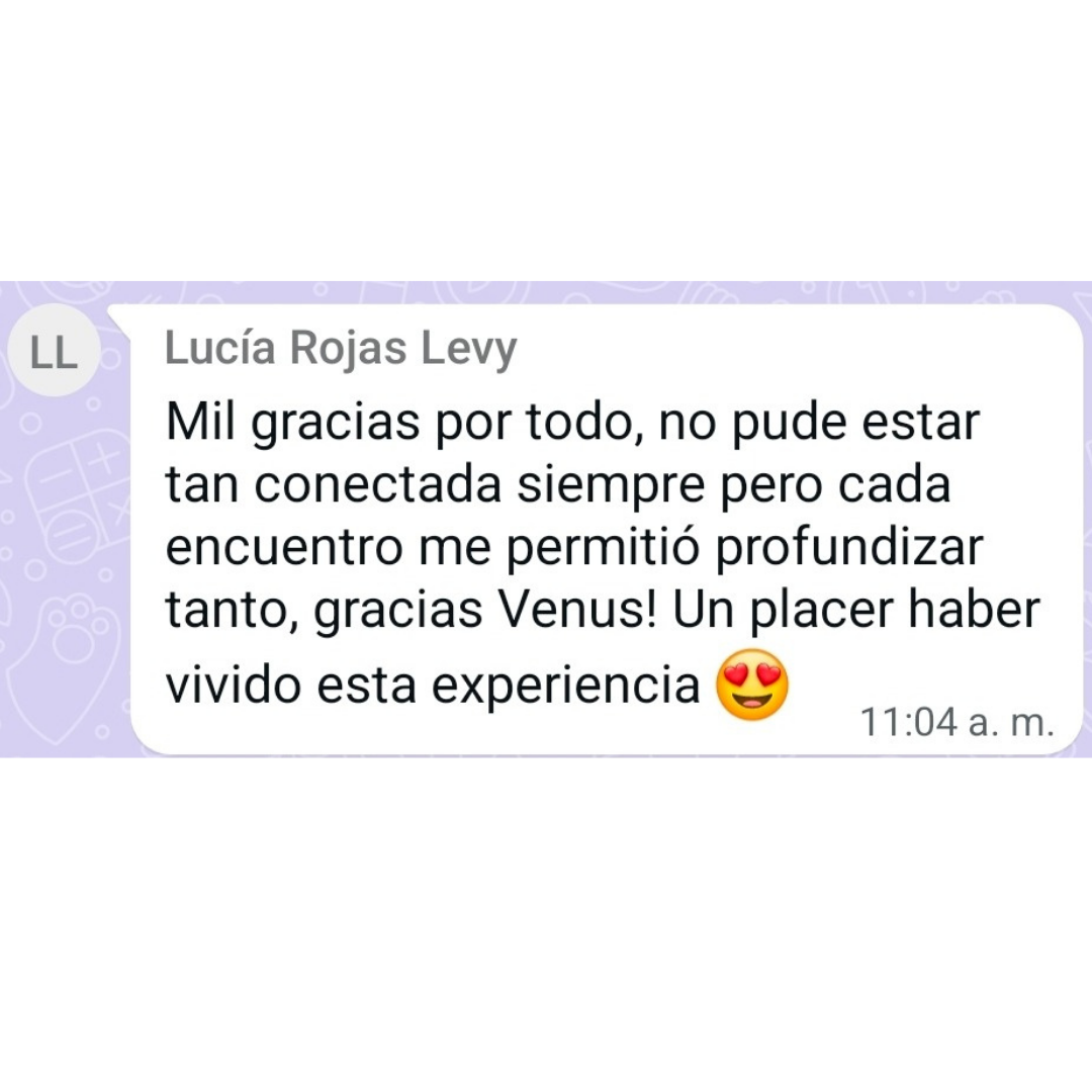 Además, tendremos 1 encuentro en vivo por Zoom de 1 hora de duración, donde te acompañaré a través de una meditacion guiada, a limpiar y a desbloquear tu canal intuitivo, integrar el proceso y resolver las dudas o preguntas que vayan surgiendo en el camino. (Este encuentro quedará grabado para que puedas volver a verlos cuando quiera).